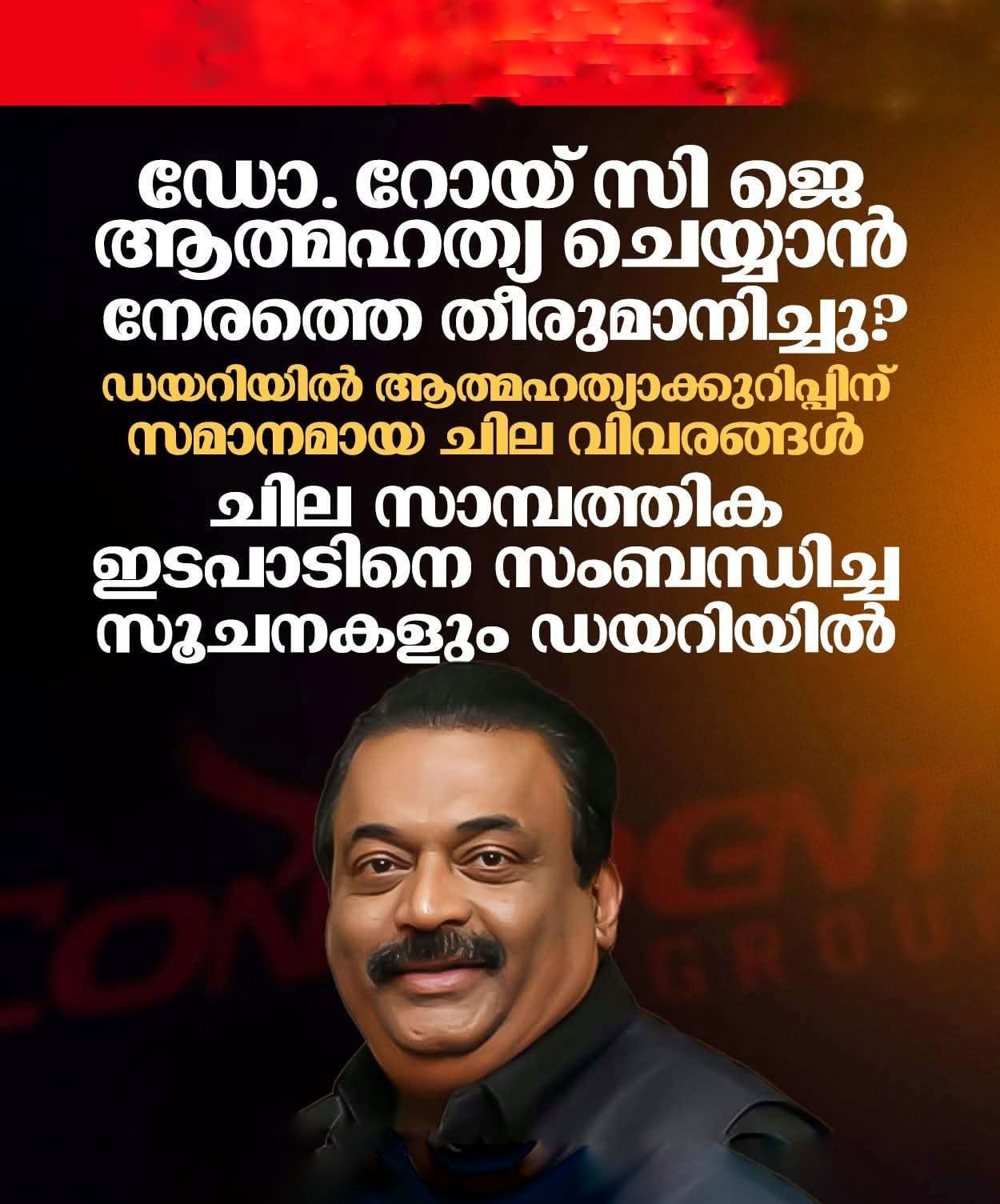 കോൺഫിഡന്റ് ഗ്രൂപ്പ് ചെയർമാൻ ഡോ. റോയ് സി.ജെ. (സി.ജെ. റോയ്) ആത്മഹത്യ ചെയ്യാൻ മുൻകൂട്ടി തീരുമാനിച്ചിരുന്നതായും കൃത്യമായ ആസൂത്രണം നടത്തിയിരുന്നതായും സൂചന നൽകുന്ന കുറിപ്പുകൾ അന്വേഷണ സംഘത്തിന് ലഭിച്ചു. കോൺഫിഡന്റ് ഗ്രൂപ്പ് ചെയർമാൻ ഡോ. റോയ് സി.ജെ. ആത്മഹത്യ ചെയ്യാൻ നേരത്തെ…
