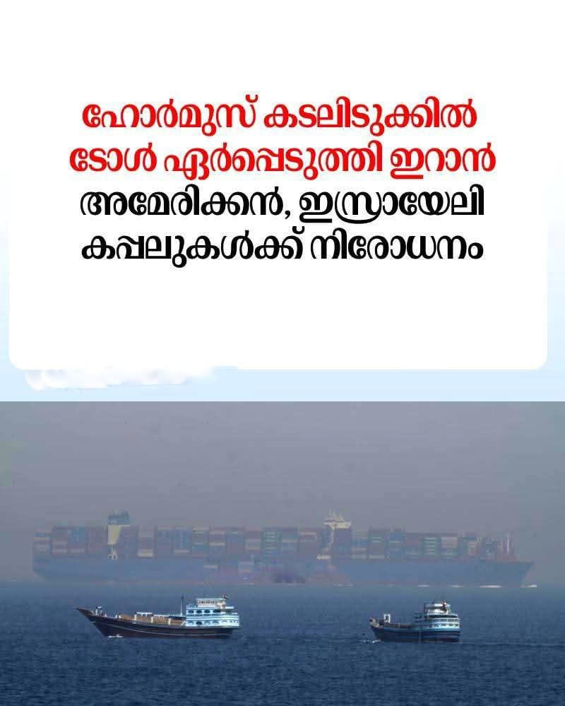 തന്ത്രപ്രധാനമായ ഹോർമുസ് കടലിടുക്കിലൂടെ കടന്നുപോകുന്ന കപ്പലുകൾക്ക് ടോൾ ഏർപ്പെടുത്താനുള്ള പുതിയ നിയമത്തിന് ഇറാന്റെ പാർലമെന്ററി സുരക്ഷാ സമിതി അംഗീകാരം നൽകി. ഇറാനിയൻ കറൻസിയായ റിയാലിൽ വേണം ഈ തുക അടയ്ക്കാൻ. അമേരിക്ക, ഇസ്രായേൽ എന്നീ രാജ്യങ്ങളുമായി ബന്ധപ്പെട്ട കപ്പലുകൾക്കും ഇറാനെതിരെ ഉപരോധം…