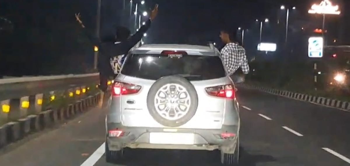കഞ്ചിക്കോട് സിഗ്നൽ കഴിഞ്ഞയുടൻ വാഹനത്തിൽ ഉണ്ടായിരുന്ന 4 യുവാക്കൾ ഡോറിൽ കയറിയിരിക്കുകയായിരുന്നു.