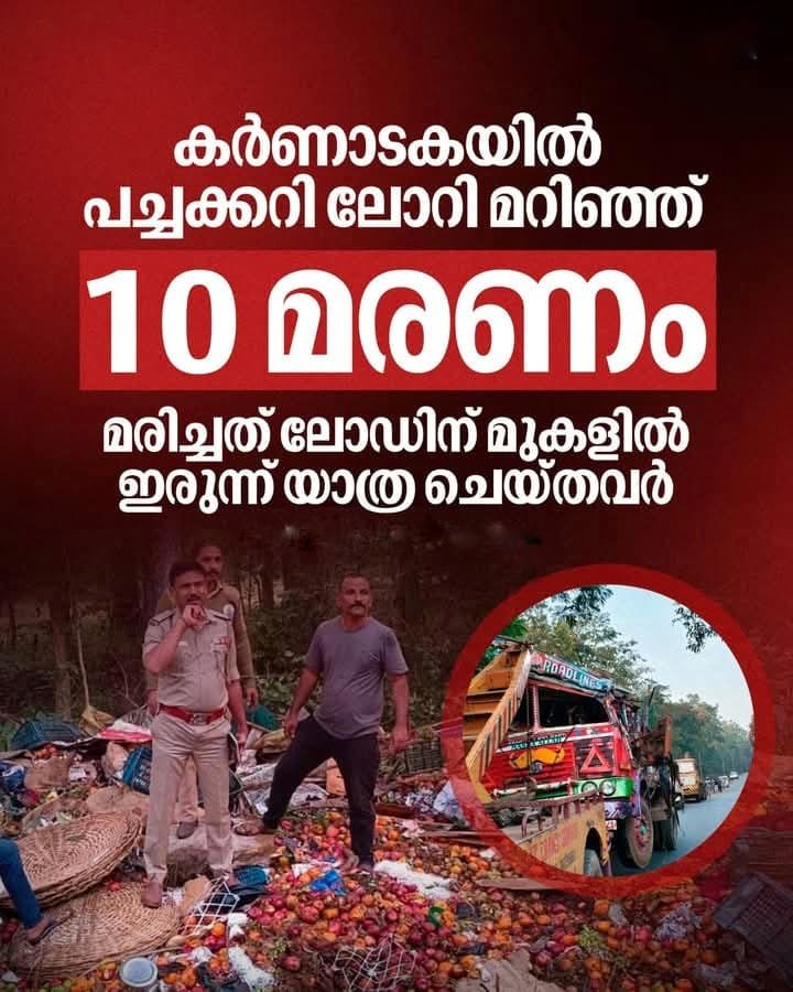ബെംഗളൂരു: കർണാടകയിൽ പച്ചക്കറി കയറ്റിവന്ന ലോറി മറിഞ്ഞ് 10 മരണം. 15 പേർക്ക് അപകടത്തിൽ പരിക്കേറ്റു. ഉത്തര കന്നഡ ജില്ലയിലെ യെല്ലപുരയിലാണ് അപകടം ഉണ്ടായത്. മൂടൽ മഞ്ഞ് കാരണം കാഴ്ചാപരിധി കുറഞ്ഞതോടെ ലോറി ഡിവൈഡറിൽ ഇടിച്ച് മറിയുകയായിരുന്നു.