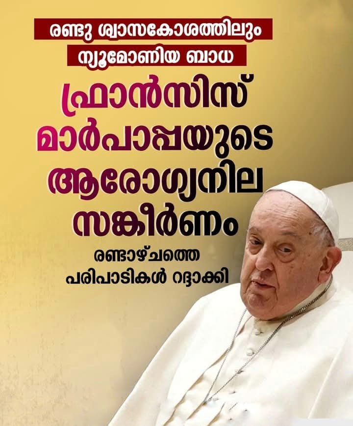 ഫ്രാൻസിസ് മാർപാപ്പയുടെ ആരോഗ്യനില സങ്കീർണമെന്ന് വത്തിക്കാൻ. അദ്ദേഹത്തിന്റെ രണ്ടു ശ്വാസകോശത്തിലും ന്യൂമോണിയ ബാധ കണ്ടെത്തി. ഇതേ തുടർന്ന് മാർപാപ്പയുടെ ഒരാഴ്ചത്തെ പരിപാടികൾ റദ്ദാക്കിയിരിക്കുകയാണ്. ഒരു ആഴ്ചയിലേറെയായി അദ്ദേഹത്തിന് ശ്വാസകോശ അണുബാധ തുടങ്ങിയിട്ട്, അതെ തുടർന്ന് ഫെബ്രുവരി 14 ന് റോമിലെ ജെമെല്ലി…