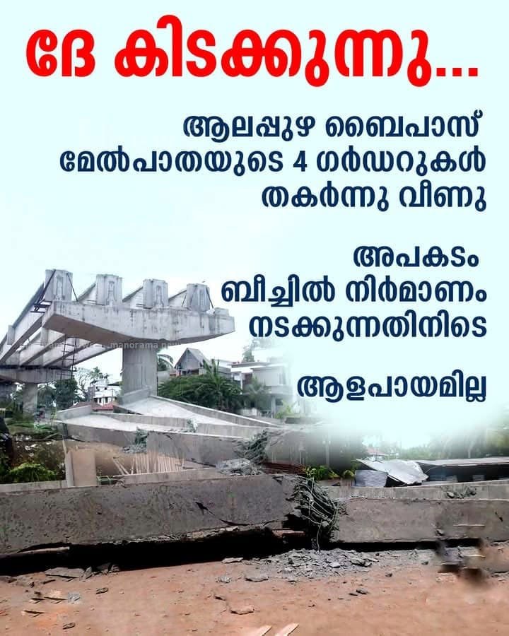 ആലപ്പുഴ: ആലപ്പുഴ ബൈപ്പാസിന്റെ ബീച്ച് ഭാഗത്തെ നിര്മാണത്തിലിരുന്ന ഉയരപ്പാതയുടെ ഗര്ഡറുകള് തകര്ന്നുവീണു. നാല് ഗര്ഡറുകളാണ് നിലംപതിച്ചത്. സംഭവത്തില് ആളപായമില്ല. രണ്ട് മേല്പാതകളാണ് ഇവിടെയുള്ളത്. ഒന്നിന്റെ നിര്മാണം പുരോഗമിക്കുകയാണ്. മറ്റേത് ഗതാഗതത്തിന് തുറന്നുകൊടുത്തിട്ടുണ്ട്.ജില്ലാ കളക്ടര് അലക്സ് വര്ഗീസ് അപകടസ്ഥലം സന്ദര്ശിച്ചു. ദേശീയപാതാ ഉദ്യോഗസ്ഥരോട്…