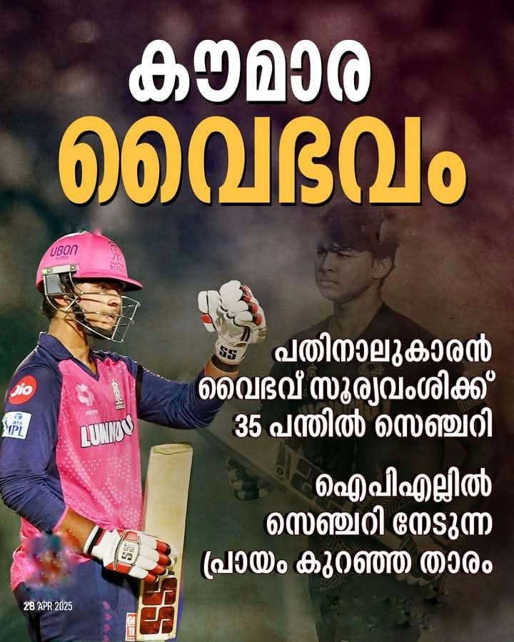 VaibhavSuryavanshi #RajasthanRoyals #RRvsGT #ipl2025 Read More> Post navigationആദ്യം ബാറ്റ് ചെയ്ത കേരളം 47.3 ഓവറിൽ 233 റൺസിന് ഓൾ ഔട്ടായപ്പോൾ മറുപടി ബാറ്റിങ്ങിൽ ഒമാൻ ചെയർമാൻസ് ഇലവൻ ആറ് ഓവർ ബാക്കി നിൽക്കെ അഞ്ച് വിക്കറ്റ് നഷ്ടത്തില് ലക്ഷ്യത്തിലെത്തി വിദൂരമെങ്കിലും രാജസ്ഥാന് റോയല്സ് പ്ലേ ഓഫ് പ്രതീക്ഷ നിലനിര്ത്തി മാറ്റമില്ലാതെ ഗുജറാത്ത്
