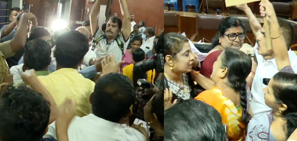 കൗണ്സില് ഹാളിനകത്ത് എല്ഡിഎഫ്-യുഡിഎഫ് അംഗങ്ങള് പ്ലക്കാര്ഡ് ഉയര്ത്തിയായിരുന്നു പ്രതിഷേധിച്ചത്. പ്രതിപക്ഷ അംഗങ്ങള് ചെയര്പേഴ്സണ് കരിങ്കൊടി കാണിച്ചിരുന്നു. പിന്നാലെയാണ് ഭരണ-പ്രതിപക്ഷ അംഗങ്ങള് തമ്മില് കൂട്ടയടി തുടങ്ങിയത്.