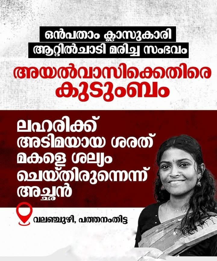 പത്തനംതിട്ട വലഞ്ചുഴിയിൽ പതിനാല് വയസ്സുകാരി നദിയിൽ ചാടി മരിച്ച സംഭവത്തിൽ അയൽവാസിയായ യുവാവിനെ പൊലീസ് കസ്റ്റഡിയിലെടുത്തു. ഇന്നലെയാണ് അഴൂർ സ്വദേശി ആവണി പുഴയിൽ ചാടി മരിച്ചത്. ആവണി മാതാപിതാക്കളോടും സഹോദരനോടും ഒപ്പം ഉത്സവം കാണാൻ എത്തുകയും അവിടെ വെച്ച് അയൽവാസിയായ ശരത്…