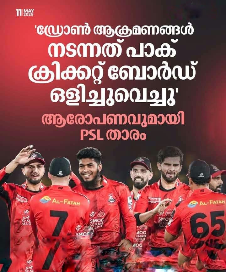 Cricket #pakistancricketteam #Pakistan Post navigationIPL 2025 മത്സരങ്ങള് അനിശ്ചിത കാലത്തേക്ക് നിര്ത്തിവച്ചു ഇന്നലെ വൈകുന്നേരം ഗുജറാത്ത് നരേന്ദ്ര മോദി സ്റ്റേഡിയത്തിൽ ടീം പരിശീലനം പുനരാരംഭിച്ചു