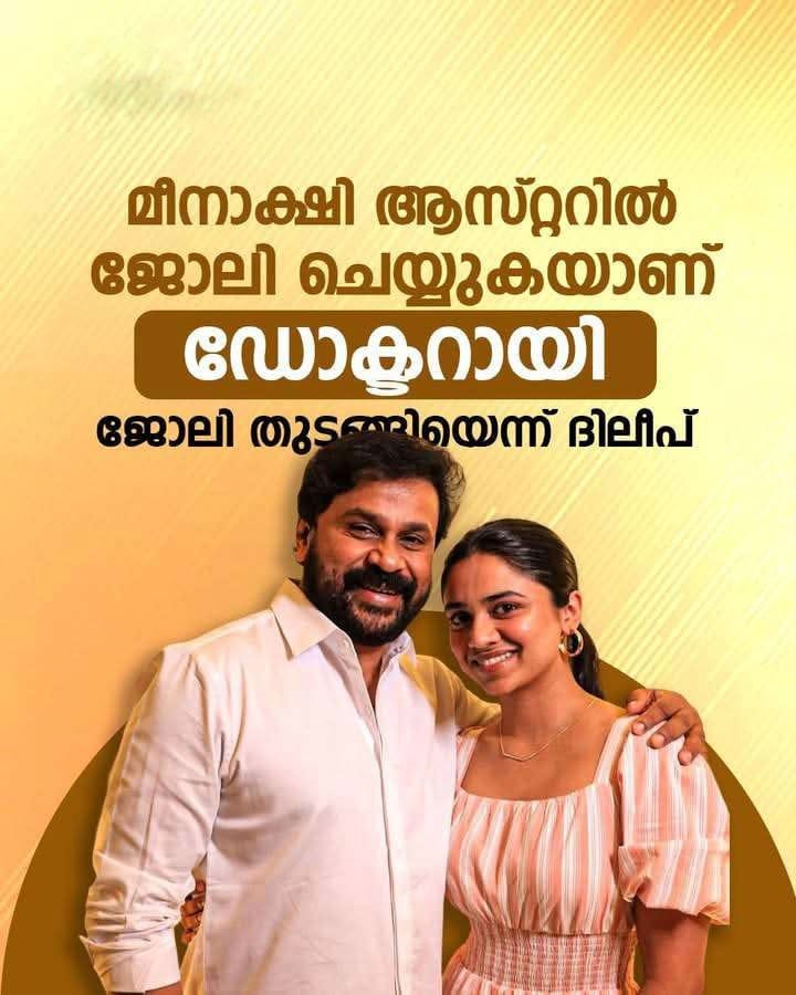 പുതിയ സിനിമയായ ‘പ്രിൻസ് ആൻഡ് ഫാമിലി’യുടെ പ്രമോഷൻ പരിപാടിക്കിടെയാണ് മീനാക്ഷിയ്ക്ക് ജോലി കിട്ടിയതിനെ കുറിച്ച് ദിലീപ് സംസാരിച്ചത്. മീനാക്ഷി ആസ്റ്റർ ഹോസ്പിറ്റലിൽ ജോലി ചെയ്യുകയാണെന്നും വീട്ടിലൊരു ഡോക്ടർ ഉള്ളതിനാൽ ഇടയ്ക്കിടയ്ക്ക് ആശുപത്രിയിൽ പോകാമെന്നും ദിലീപ് പറഞ്ഞു.