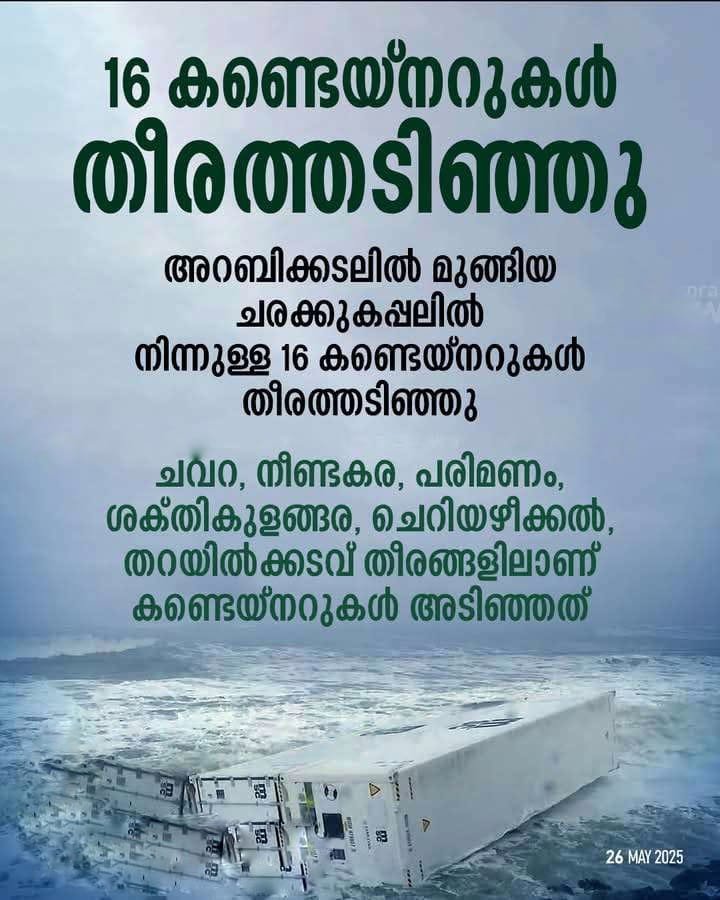 കണ്ടെത്തിയ 13 കണ്ടെയ്നറുകളിൽ കാൽസ്യം കാർബൈഡാണെന്ന് ദുരന്തനിവാരണ അതോറിറ്റി സ്ഥിരീകരിച്ചു. ഇവ തീ പിടിക്കുന്നതും പൊള്ളൽ ഏൽപ്പിക്കുന്നതുമായ വസ്തുക്കളാണെന്നും അതോറിറ്റി മുന്നറിയിപ്പ് നൽകി. കൂടുതൽ കണ്ടെയ്നറുകളും ചെറിയ ബോക്സുകളും ഒഴുകി വരുമെന്നും ജനങ്ങൾ ജാഗ്രത പാലിക്കണമെന്നും ദുരന്തനിവാരണ അതോറിറ്റി മെമ്പർ സെക്രട്ടറി…