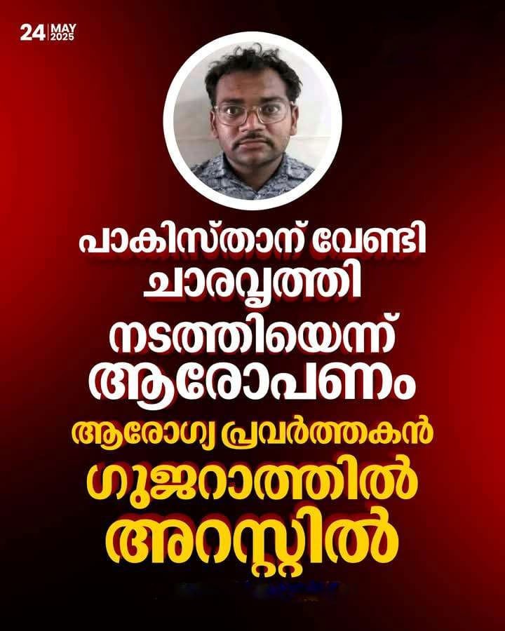 പാകിസ്താന് വേണ്ടി ചാരവൃത്തി നടത്തിയെന്ന് ആരോപണം ആരോഗ്യപ്രവർത്തകൻ ഗുജറാത്തിൽ അറസ്റ്റിൽ