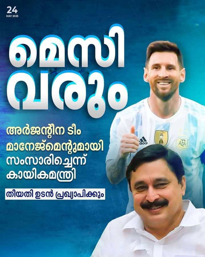 മെസി കേരളത്തിലേക്ക് വരും, അർജന്റീന ടീം മാനേജ്മെന്റുമായി സംസാരിച്ചു സംയുക്ത വാർത്താ സമ്മേളനം നടത്തി തീയതി പ്രഖ്യാപിക്കുമെന്ന് കായികമന്ത്രി