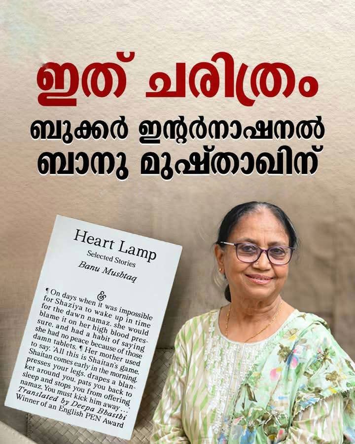 ലണ്ടൻ • ഇന്റർനാഷനൽ ബുക്കർ പ്രൈസ് കന്നഡ എഴുത്തുകാരിയും സാമൂഹിക പ്രവർത്തകയുമായ ബാനു മുഷ്താഖിന്. ‘ഹാർട്ട് ലാംപ്’ എന്ന ചെറുകഥാസമാഹാരമാണ് ആറു പുസ്തകങ്ങളുടെ ചുരുക്കപ്പട്ടികയിൽനിന്ന് സമ്മാനാർഹമായത്. മാധ്യമപ്രവർത്തക കൂടിയായ ദീപ ബസ്തിയാണ് കഥാസമാഹാരം ഇംഗ്ലിഷിലേക്കു മൊഴിമാറ്റം നടത്തിയത്. സോൾവായ് ബാലിന്റെ ‘ഓൺ…