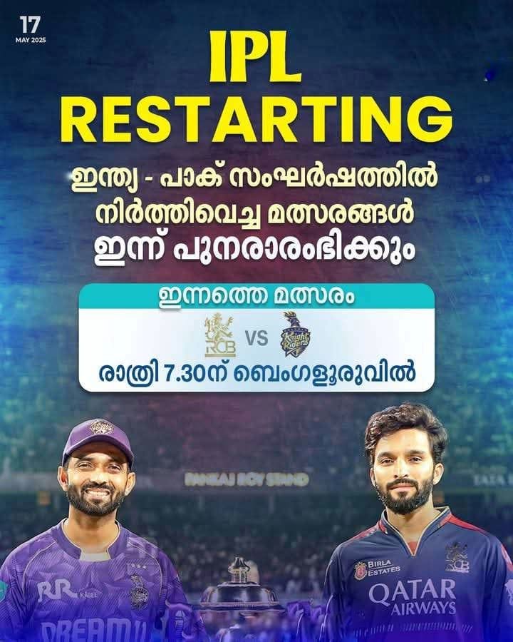 അതിര്ത്തിയിലെ സംഘര്ഷം മൂലം നിര്ത്തിവച്ച ഐപിഎല് മത്സരങ്ങള് ഇന്ന് പുനരാരംഭിക്കും. രാത്രി ഏഴരയ്ക്ക് നടക്കുന്ന മത്സരത്തില് റോയല് ചലഞ്ചേഴ്സ് ബെംഗളൂരു, കൊല്ക്കത്ത നൈറ്റ് റൈഡേഴ്സിനെ നേരിടും. രാത്രി ഏഴരയ്ക്ക് ബെംഗളൂരുവിലാണ് മത്സരം. സ്വപ്നതുല്യമായ സീസണ് പാതിയില് നിലയ്ക്കുമോയെന്ന ആശങ്കയിലായിരുന്നു ബെംഗളൂരുകാര്. 11…