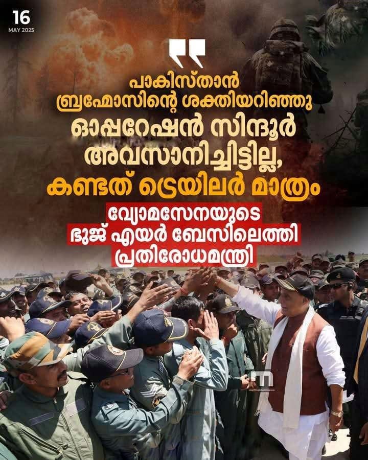 വ്യോമസേനയുടെ ഗുജറാത്തിലെ ഭുജ് എയർ ബേസിലെത്തി പ്രതിരോധമന്ത്രി പാകിസ്താൻ ബ്രഹ്മോസിന്റെ ശക്തിയറിഞ്ഞെന്നും, ഓപ്പറേഷൻ സിന്ദൂർ അവസാനിച്ചിട്ടില്ലെന്നും രാജ്നാഥ് സിങ്
