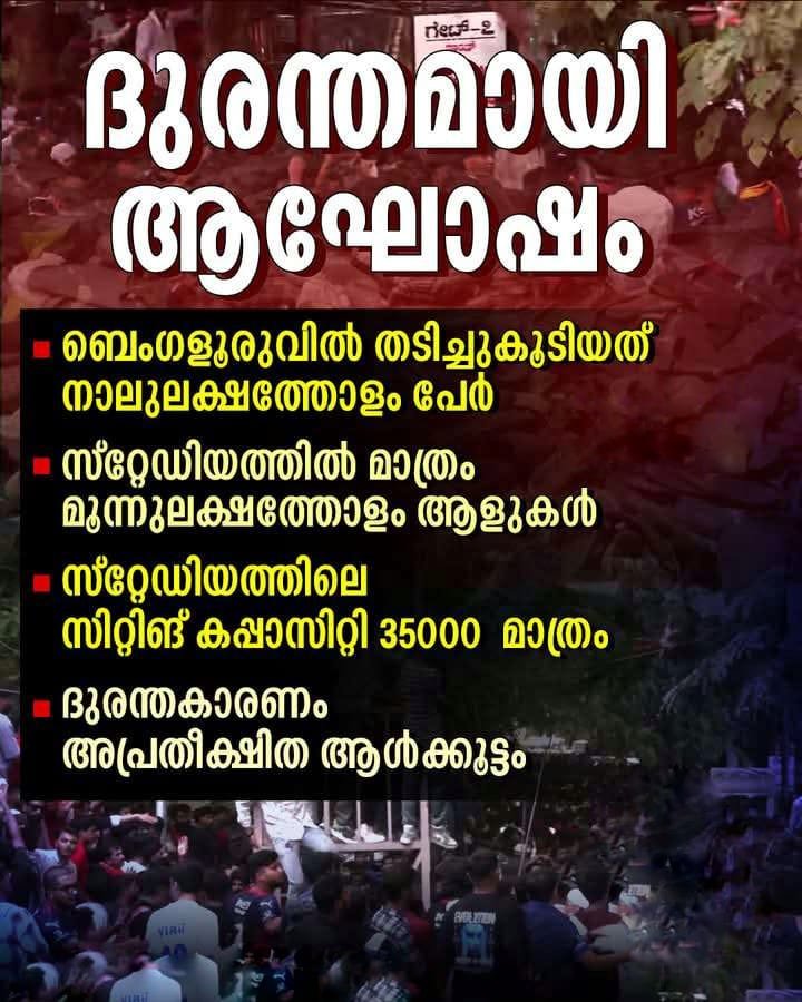 ബെംഗളൂരു: ഐപിഎല് കിരീടം നേടിയ ടീമിന്റെ വിജയാഘോഷത്തിനിടെ ഉണ്ടായ തിക്കിലും തിരക്കിലുംപെട്ട് ആരാധകർ കൊല്ലപ്പെട്ടതിൽ അനുശോചനം അറിയിച്ച് റോയല് ചലഞ്ചേഴ്സ് ബെംഗളൂരു. ദൗർഭാഗ്യകരമായ സംഭവമാണ് ഉണ്ടായതെന്നും ആരാധകരുടെ ജീവൻ നഷ്ടമായതിൽ അതിയായ ദുഖമുണ്ടെന്നും ആര്സിബിദുരന്തത്തില് മരിച്ചവരുടെ കുടുംബാംഗങ്ങളുടെ ദുഖത്തിൽ പങ്കുചേരുന്നു. അപകട…