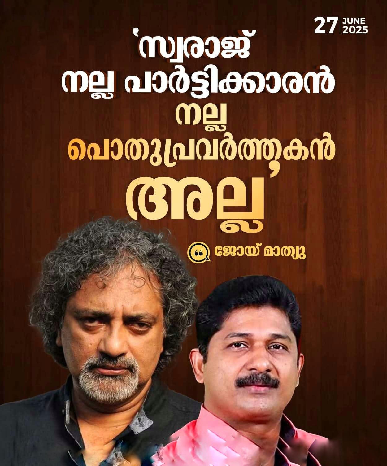സ്വരാജ് നല്ല പാർട്ടിക്കാരൻ, നല്ല പൊതു പ്രവർത്തകൻ അല്ല ജോയ് മാത്യു