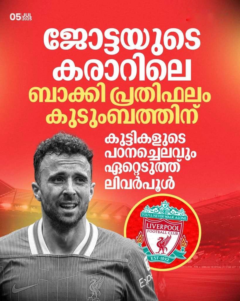 അകാലത്തിൽ വിടപറഞ്ഞ ഡിയാഗോ ജോട്ടയുടെ കരാറിൽ ശേഷിക്കുന്ന കാലത്തെ ശമ്പളം കുടുംബത്തിന് നൽകുമെന്ന് പ്രഖ്യാപിച്ച് ലിവർപൂൾ ക്ലബ്. ജോട്ടയുടെ കുട്ടികളുടെ പഠനച്ചെലവും ക്ലബ് ഏറ്റെടുക്കുമെന്ന് ലിവർപൂൾ പ്രസ്താവനയിൽ പറഞ്ഞു.