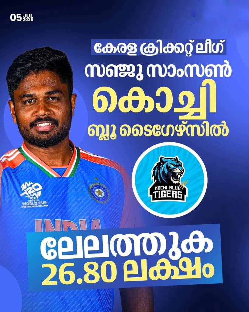 കേരള ക്രിക്കറ്റ് ലീഗ് രണ്ടാം സീസണിൽ ഇന്ത്യൻ താരം സഞ്ജു സാംസൺ കൊച്ചി ബ്ലൂ ടൈഗേഴ്സിനായി കളിക്കും. 26 ലക്ഷത്തി 80,000 രൂപയ്ക്കാണ് സഞ്ജുവിനെ കൊച്ചി ബ്ലൂ ടൈഗേഴ്സ് സ്വന്തമാക്കിയത്. തൃശ്ശൂർ ടൈറ്റൻസും അദാനി ട്രിവാൻഡ്രം റോയൽസും സഞ്ജുവിനായി രംഗത്തുണ്ടായിരുന്നു. ഇതിൽ തൃശ്ശൂരും കൊച്ചിയും തമ്മിൽ സഞ്ജുവിനായി ശക്തമായ മത്സരം നടന്നു.