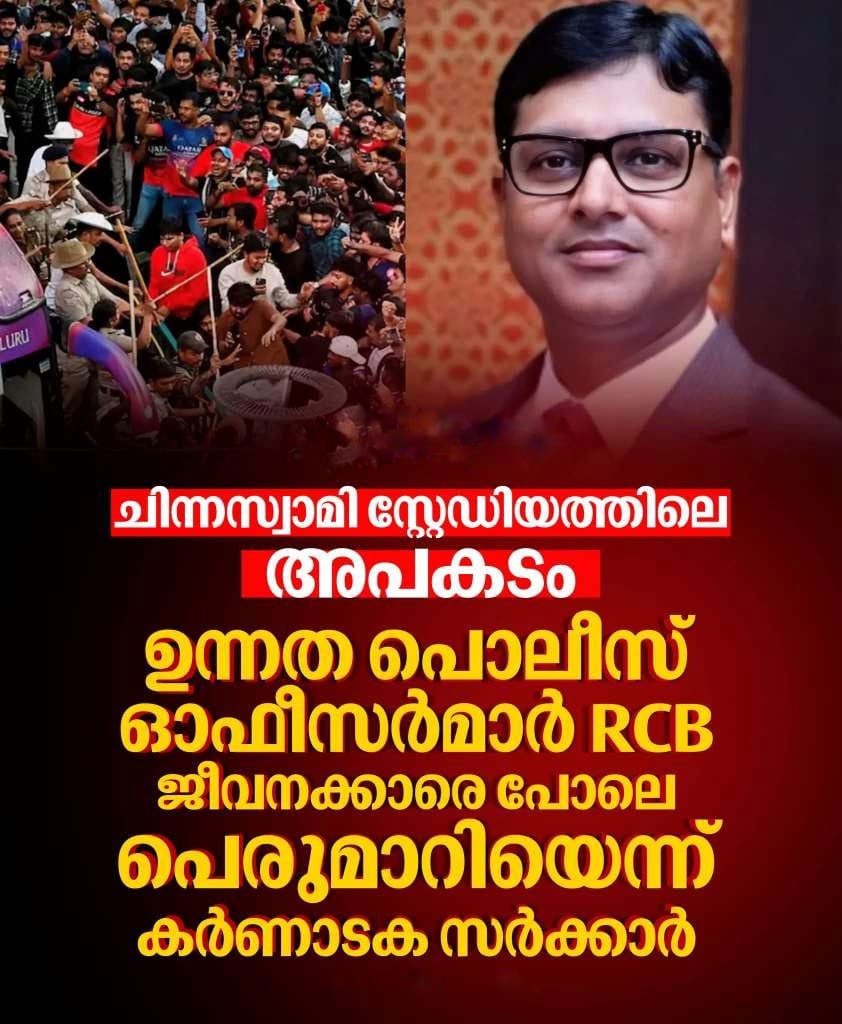 ബെംഗളൂരു: ഉന്നത പൊലീസ് ഓഫീസർമാർ റോയൽ ചലഞ്ചേഴ്സ് ബെംഗളൂരുവിൻ്റെ ജീവനക്കാരെ പോലെ പെരുമാറിയെന്ന് കർണാടക സർക്കാർ ഹൈക്കോടതിയിൽ വ്യക്തമാക്കി. ചിന്നസ്വാമി സ്റ്റേഡിയത്തിന് പുറത്ത് തിക്കിലും തിരക്കിലും പെട്ട് 11 പേർ മരിച്ച സംഭവുമായി ബന്ധപ്പെട്ട് ഐപിഎസ് ഓഫീസർ വികാഷ് കുമാറിൻ്റെ സസ്പെൻഷൻ…
