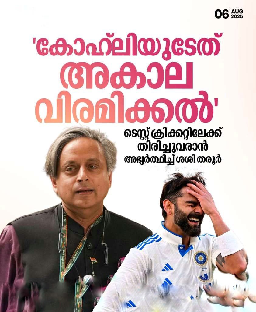 ടെസ്റ്റ് ക്രിക്കറ്റിൽ നിന്നുള്ള വിരാട് കോഹ്ലിയുടെ വിരമിക്കലിൽ പുതിയ ചർച്ചകൾക്ക് വഴിമരുന്നിട്ട് കോൺഗ്രസ് എംപി ശശി തരൂർ. കോഹ്ലിയുടെ വിരമിക്കലിനെ ‘അകാല’ മെന്ന് വിശേഷിപ്പിച്ച തരൂർ വിരാട് എത്രയും പെട്ടെന്ന് ടെസ്റ്റ് ക്രിക്കറ്റിലേക്ക് മടങ്ങണമന്നും അഭ്യർത്ഥിച്ചു.