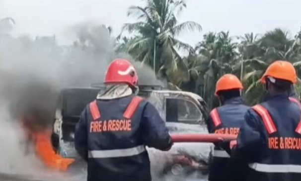 കോഴിക്കോട് ഫ്ലൈ ഓവറിർ ഓടിക്കൊണ്ടിരുന്ന ഒമിനി വാനിന് തീപിടിച്ചു