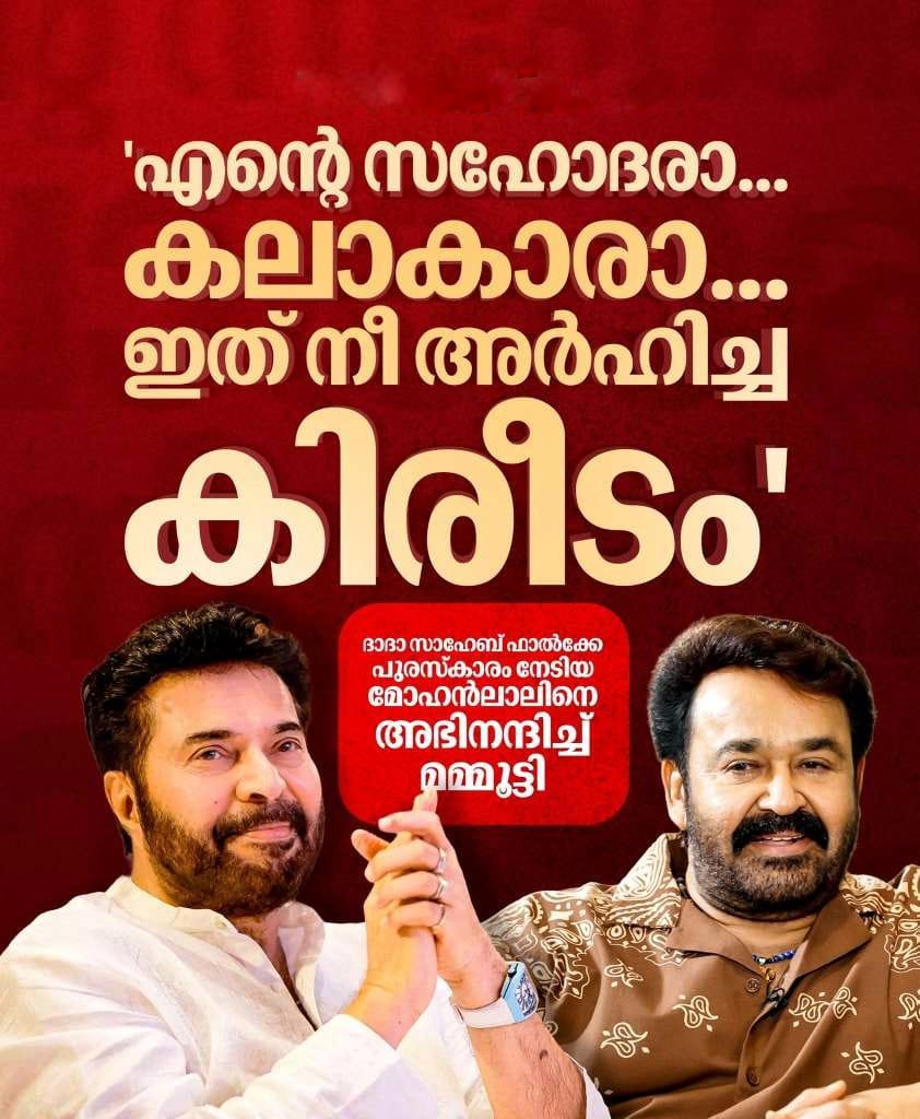 ‘ഒരു സഹപ്രവര്‍ത്തകന്‍ എന്നതിലുപരി താങ്കള്‍ എന്റെ സഹോദരനാണ്, സിനിമയോടൊപ്പം ദശാബ്ദങ്ങളായി സഞ്ചരിക്കുന്ന കലാകാരനാണ്. നടന്‍ എന്ന നിലയില്‍ മാത്രമല്ല ദാദാ സാഹിബ് ഫാല്‍ക്കേ അവാര്‍ഡ് താങ്കള്‍ക്ക് ലഭിച്ചിരിക്കുന്നത്.