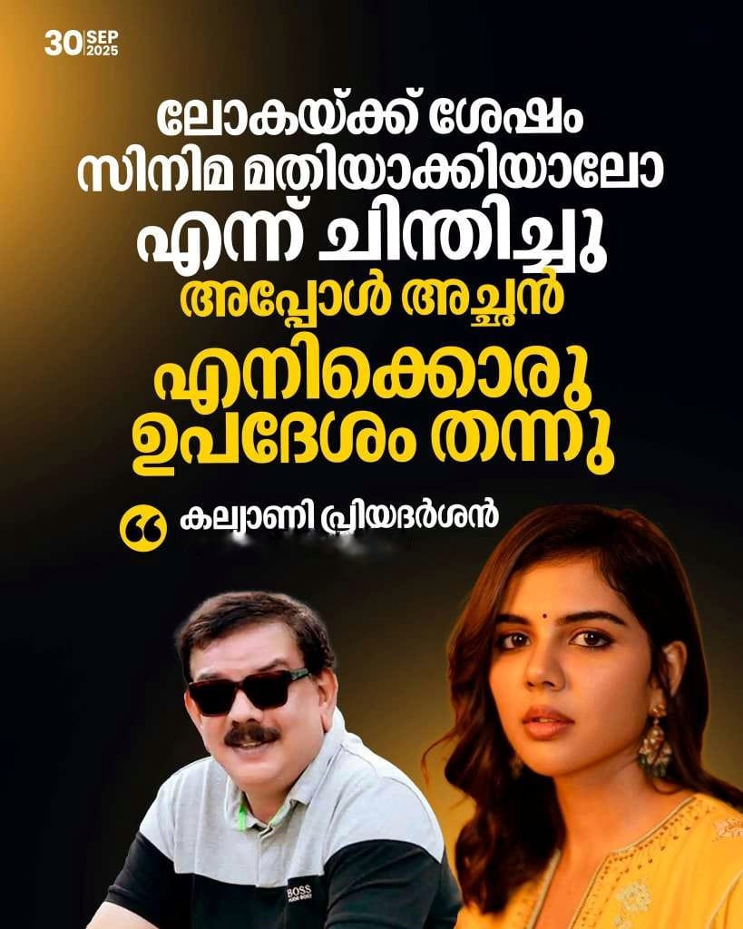 അച്ഛന്റെ ആ വാക്കുകൾ തനിക്ക് വലിയ പ്രചോദനം നൽകിയെന്ന് കല്യാണി പറഞ്ഞു.ലയാള സിനിമയായി മാറിയിരിക്കുകയാണ് ലോക. രണ്ട് ലക്ഷത്തിലേറെ വോട്ടുകളാണ് സിനിമ നേടിയിരിക്കുന്നത്. പോസ്റ്റർ പങ്കുവച്ചുകൊണ്ട് സിനിമയുടെ നിർമാതാക്കൾ തന്നെയാണ് ഇക്കാര്യം അറിയിച്ചിരിക്കുന്നത്.