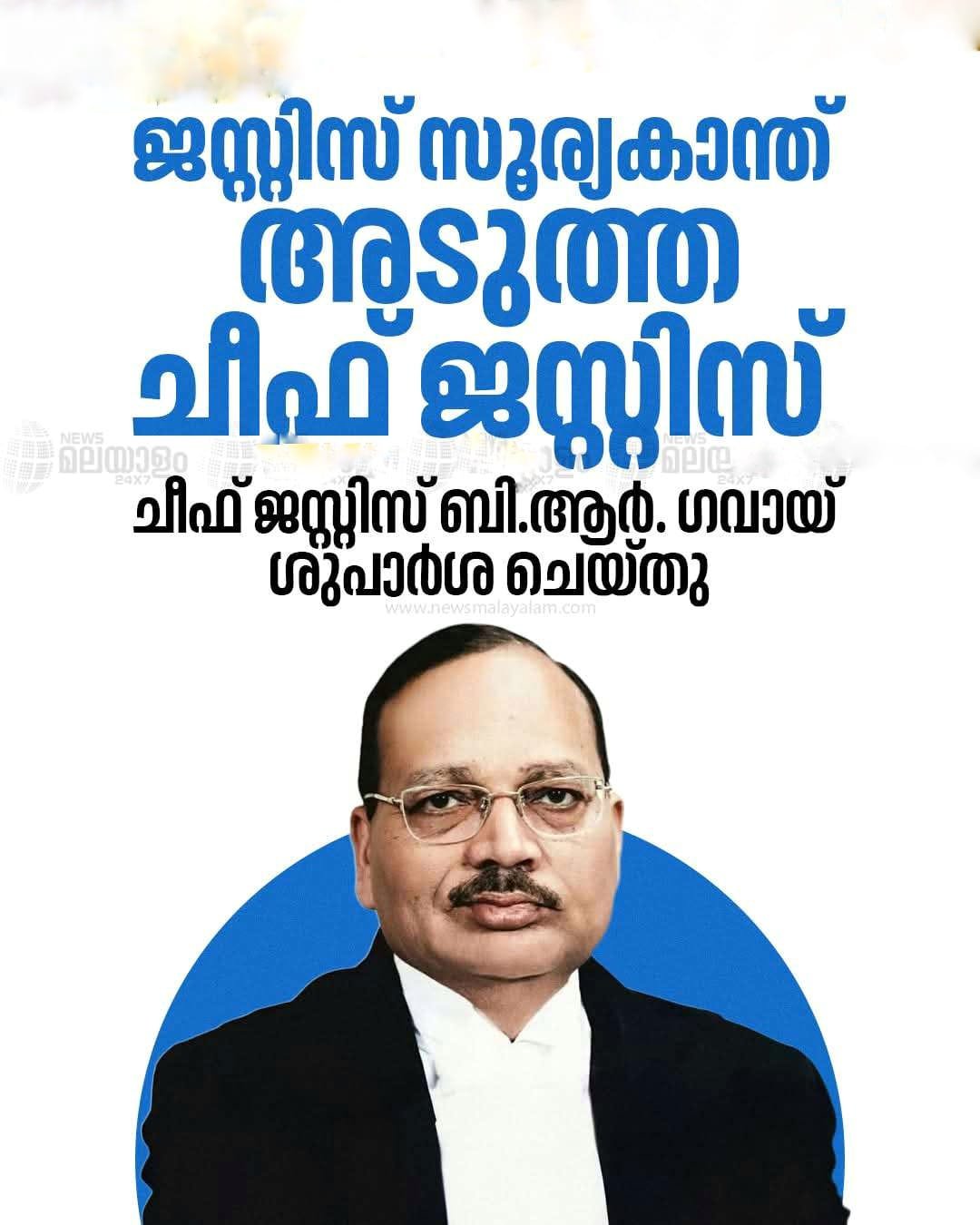 തിരുവന്തപുരം: ജസ്റ്റിസ് സൂര്യകാന്തിന് അടുത്ത ചീഫ് ജസ്റ്റിസായി ശുപാര്‍ശ. നിലവിലെ ചീഫ് ജസ്റ്റിസ് ബി.ആര്‍. ഗവായിയാണ് ചീഫ് ജസ്റ്റിസിനെ ശുപാര്‍ശ ചെയ്തത്. നവംബര്‍ 23നാണ് ഹി.ആര്‍. ഗവായി വിരമിക്കുന്നത്. തുടര്‍ന്നുള്ള നടപടി ക്രമങ്ങളുടെ ഭാഗമായി ഒരു മാസം മുമ്പ് തന്നെ കേന്ദ്രത്തിന് അടുത്ത ചീഫ് ജസ്റ്റിലിന്റെ പേര് ശുപാര്‍ശ ചെയ്യേണ്ടതുണ്ട്.