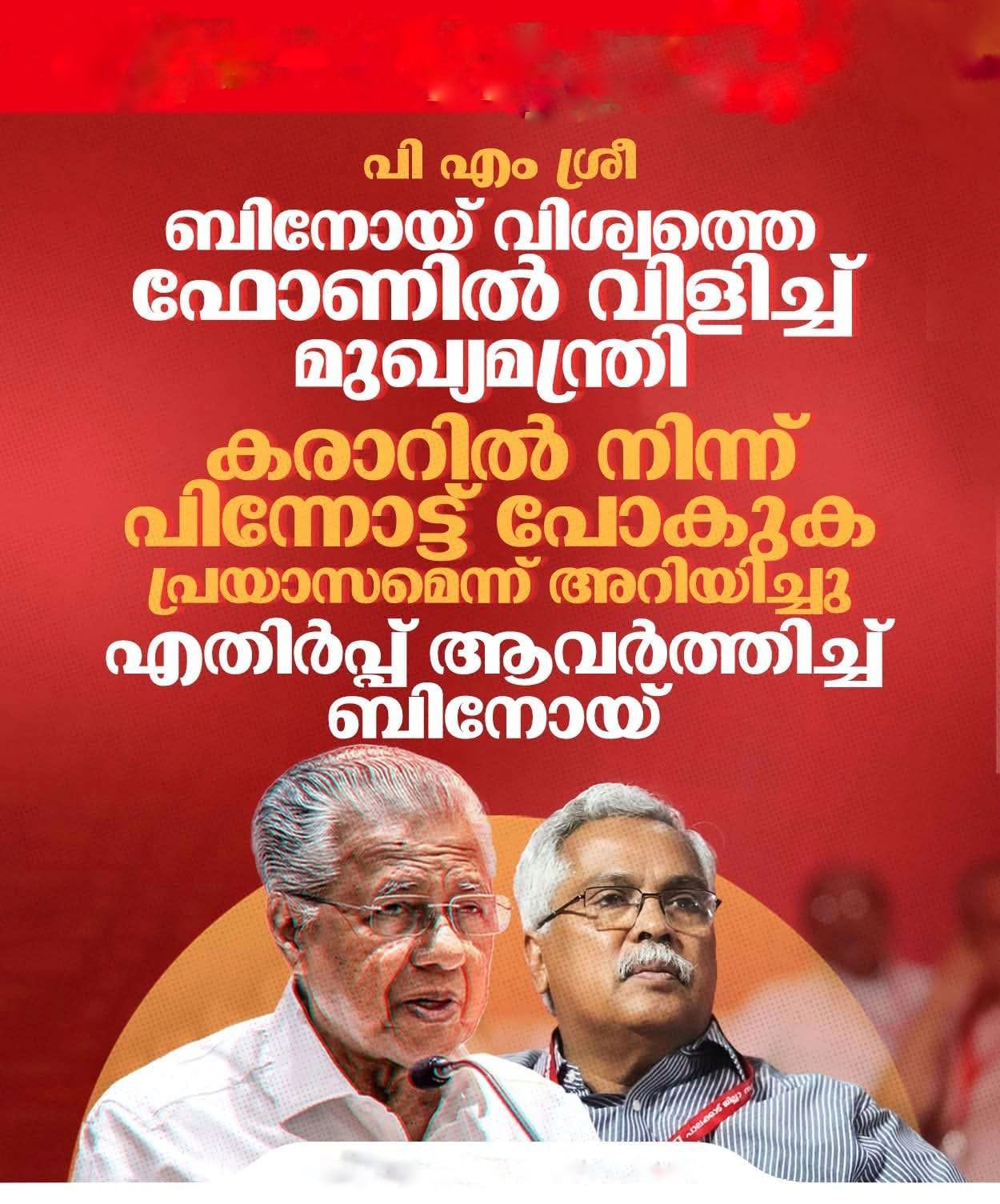 പിഎം ശ്രീ പദ്ധതിയില്‍ ഇടഞ്ഞ് നില്‍ക്കുന്ന സിപിഐയെ അനുനയിപ്പിക്കാന്‍ മുഖ്യമന്ത്രി. ബിനോയ് വിശ്വത്തെ ഫോണില്‍ വിളിച്ചു. പി എം ശ്രീയില്‍ കരാറില്‍ നിന്ന് പിന്നോട്ട് പോകുക പ്രയാസമെന്ന് മുഖ്യമന്ത്രി അറിയിച്ചതായാണ് വിവരം. ബിനോയ് വിശ്വവുമായുള്ള ഫോണ്‍ സംഭാഷണത്തിലാണ് നിലപാട് അറിയിച്ചത്.