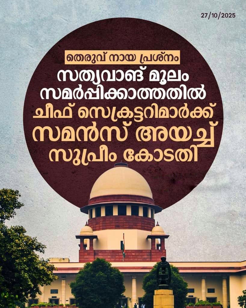 ന്യൂഡൽഹി: തെരുവ് നായ പ്രശ്നത്തിൽ സത്യവാങ് മൂലം സമർപ്പിക്കാത്തതിനാൽ ചീഫ് സെക്രട്ടറിമാർക്ക് സമൻസ് അയച്ച് സുപ്രീം കോടതി. എല്ലാ ചീഫ് സെക്രട്ടറിമാരും നേരിട്ട് ഹാജരായി വിശദീകരണം നൽകണമെന്ന നിർദേശം നൽകി.