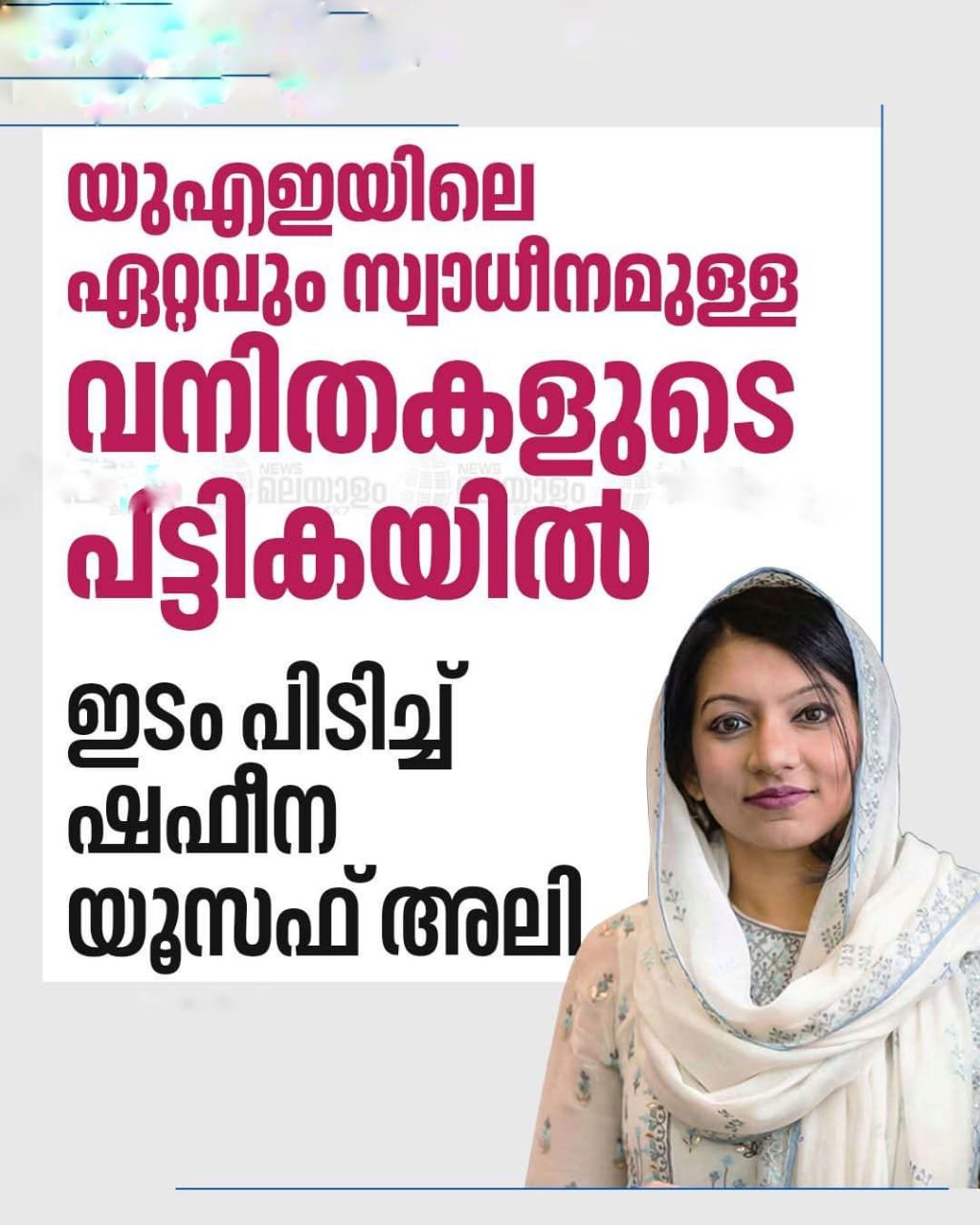 എൻ്റെ ജീവിതസഖി ഷഫീന യൂസഫ് അലിയെ ഖലീജ് ടൈംസ് പവർ വിമൻ 50 പട്ടികയിൽ ഉൾപ്പെടുത്തിയിരിക്കുന്നത് കാണുന്നത് എനിക്ക് അതിയായ അഭിമാന നിമിഷമാണ് — യുഎഇയിലെ നവീകരണം, സമത്വം, വളർച്ച എന്നിവക്ക് നേതൃത്വം നൽകുന്ന സ്ത്രീ നേതാക്കളെ ആദരിക്കുന്ന പട്ടികയാണിത്.