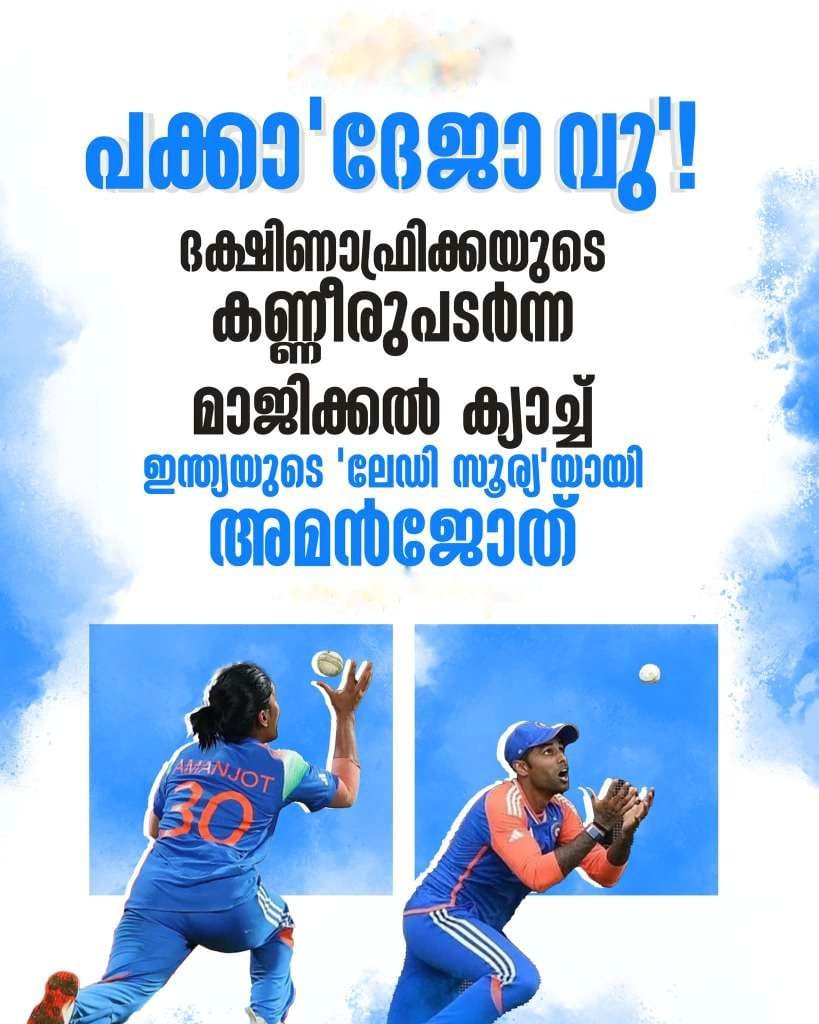 പ്രോട്ടീസ് നായികയുടെ പുറത്താവലാണ് ഇന്ത്യയുടെ വിജയത്തിൽ അതിനിർണായകമായത്.എന്നാൽ അമൻജോത് കൗറിന്റെ ക്യാച്ചിനെ 2024 ട്വന്റി 20 ലോകകപ്പിൽ സൂര്യകുമാറിന്റെ ക്യാച്ചുമായാണ് ആരാധകർ താരതമ്യം ചെയ്യുന്നത്.