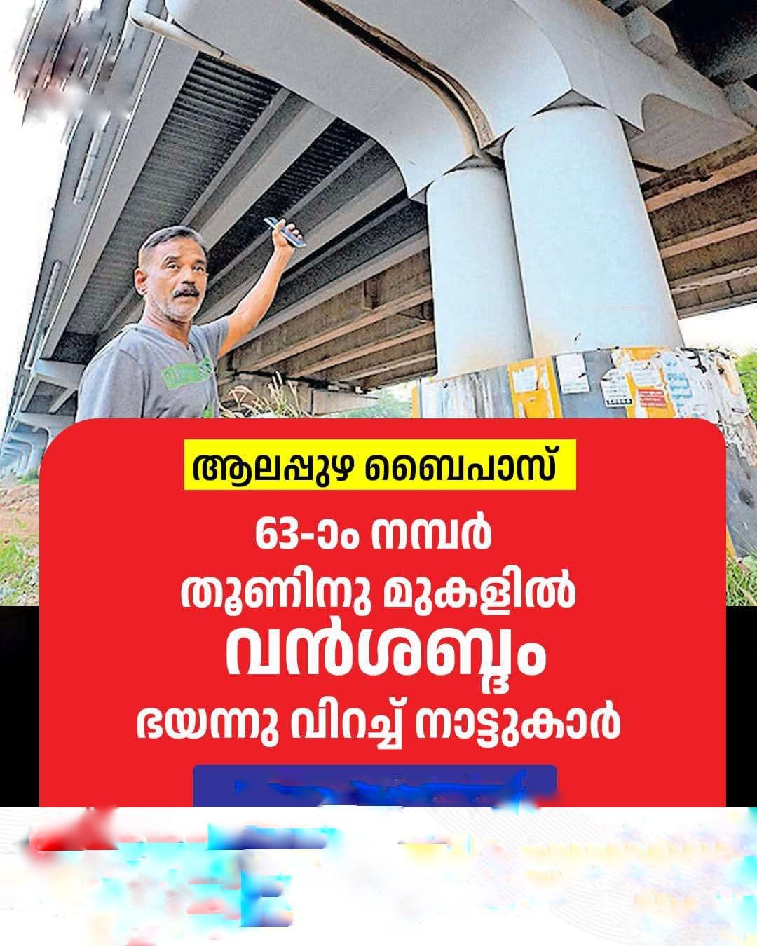 ആലപ്പുഴ ∙ ബൈപാസിന്റെ 63-ാം നമ്പർ തൂണിന്റെ മുകളിൽ രണ്ട് ഗർഡറുകൾ ചേരുന്ന ഭാഗത്ത് ഉഗ്ര ശബ്ദം. ബൈപാസിലൂടെ വാഹനങ്ങൾ പോകുമ്പോഴാണ് ശബ്ദം ഉണ്ടാകുന്നത്. ഗർഡറുകൾ യോജിപ്പിച്ചു വച്ചിട്ടുള്ള ഭാഗത്ത് ഒരു വിടവ് കാണാം.