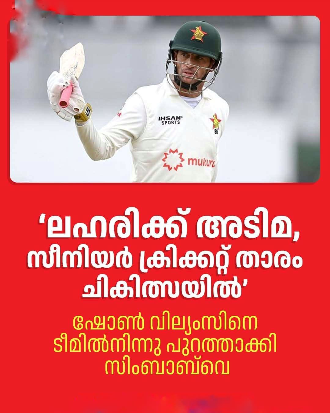 സ്വയം പുനരധിവാസം തേടിയതിനു ഞങ്ങൾ അദ്ദേഹത്തെ അഭിനന്ദിക്കുന്നെങ്കിലും ടീം ചുമതലകളിൽ നിന്ന് പിന്മാറുന്നത് പ്രഫഷനൽ, ധാർമിക മാനദണ്ഡങ്ങളെക്കുറിച്ചുള്ള ഗുരുതരമായ ആശങ്കകൾ ഉയർത്തുന്നു.’2005ലാണ് ഷോൺ വില്യംസ് സിംബാബ്വെ ക്രിക്കറ്റിൽ അരങ്ങേറ്റം കുറിച്ചത്.