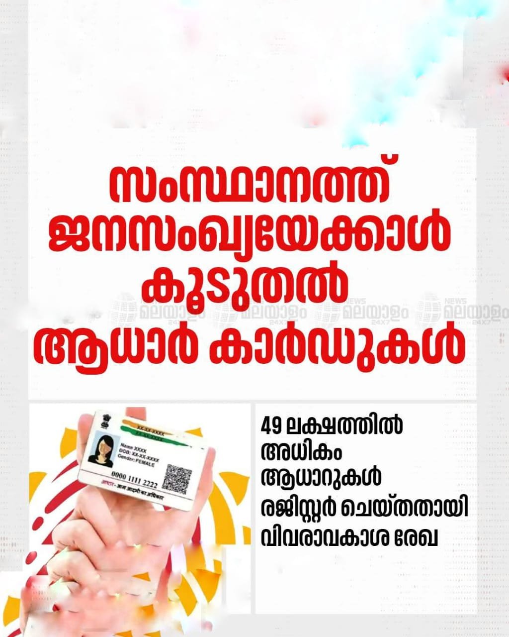 തിരുവനന്തപുരം: കേരളത്തിൽ ജനസംഖ്യയേക്കാൾ കൂടുതൽ ആധാർ കാർഡുകൾ രജിസ്റ്റർ ചെയ്യപ്പെട്ടിട്ടുണ്ടെന്ന് റിപ്പോർട്ട്. വിവരാവകാശ രേഖ പ്രകാരം കേരളത്തിൽ 49 ലക്ഷത്തിൽ അധികം ആധാറുകൾ രജിസ്റ്റർ ചെയ്തതായാണ് കണക്കുകൾ സൂചിപ്പിക്കുന്നത്.