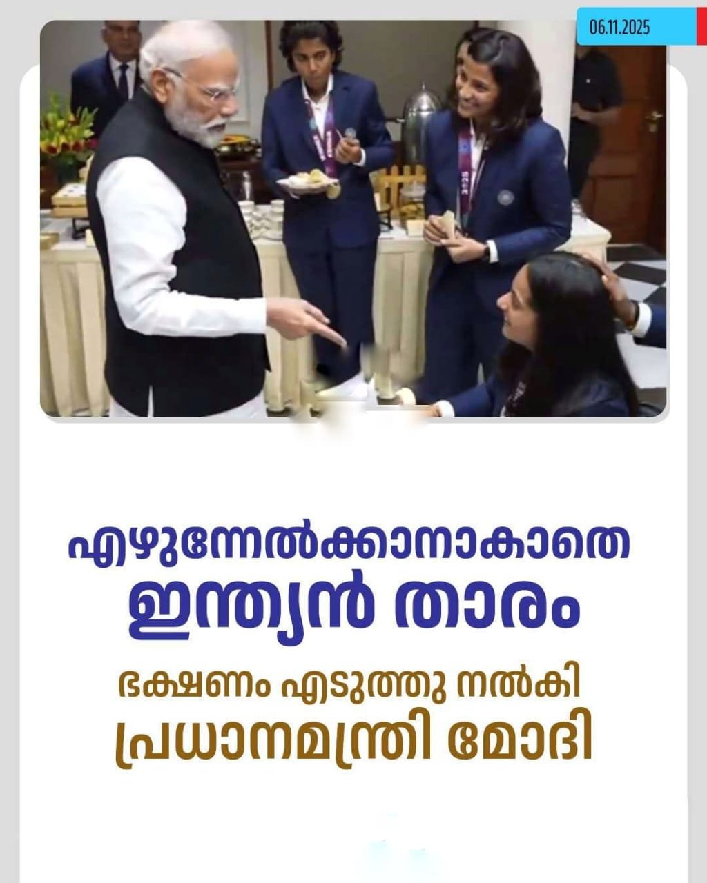 ഇന്ത്യൻ ഓൾറൗണ്ടർ അമൻജ്യോത് കൗർ നൽകിയ മെഡൽ ധരിച്ചാണ് പ്രതിക ഇന്ത്യൻ സംഘത്തിനൊപ്പം ഫോട്ടോയ്ക്കു പോസ് ചെയ്തത്.ലോകകപ്പ് ടീമിൽനിന്നു പുറത്തായതിനാൽ പ്രതികയ്ക്ക് വിജയികൾക്കുള്ള മെഡൽ ലഭിച്ചിരുന്നില്ല. ഇന്ത്യൻ താരങ്ങൾ ഭക്ഷണം കഴിക്കുന്നതിനിടെ പ്രതികയ്ക്ക് പ്രിയപ്പെട്ട ഭക്ഷ്യവിഭവങ്ങൾ പ്രധാനമന്ത്രി നരേന്ദ്രമോദിയാണ് എടുത്തു നൽകിയത്.