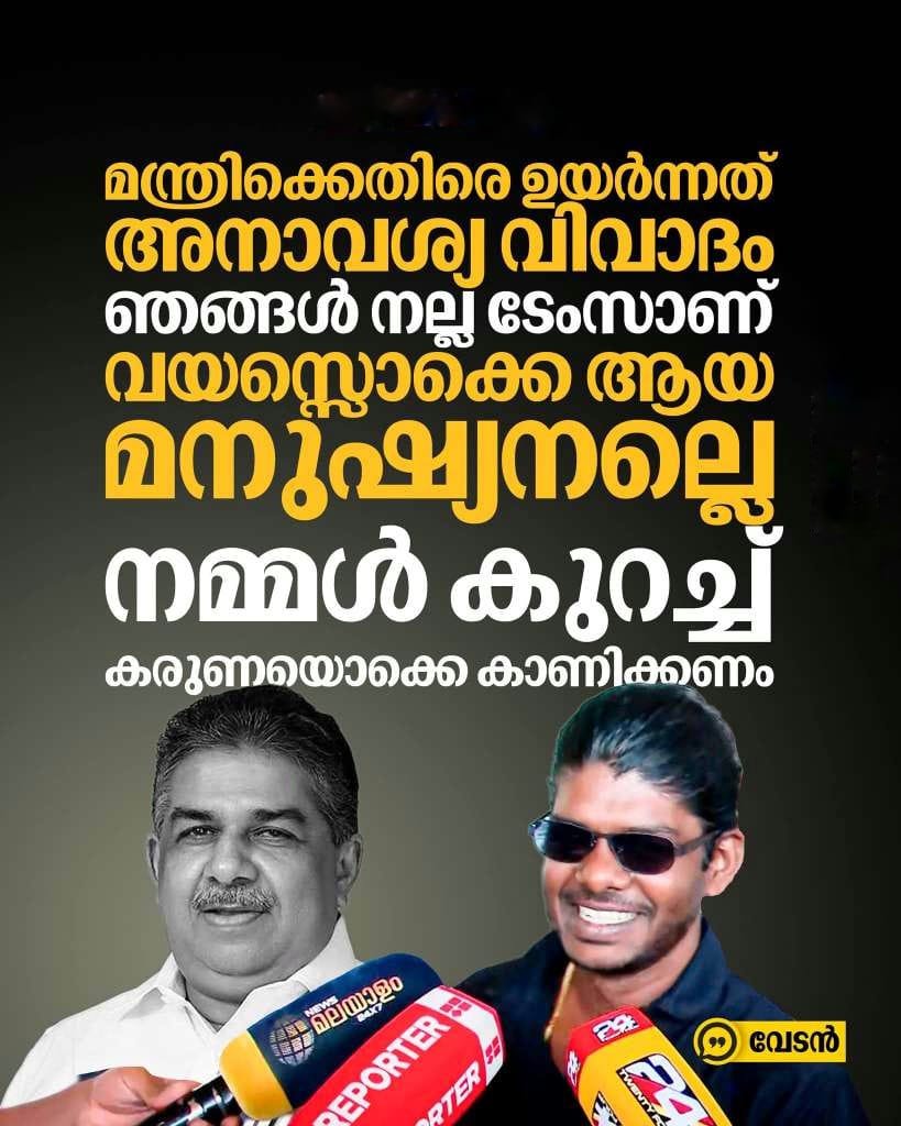താനും മന്ത്രിയുമായി പരസ്പരം നല്ല ടേമിലാണെന്നും തന്റെ വര്ക്കുമായി ബന്ധപ്പെട്ടൊക്കെ സംസാരിക്കാറുണ്ടെന്നും പറഞ്ഞ വേടന് മന്ത്രി അങ്ങനെയൊന്നും പറയില്ലെന്നും വ്യക്തമാക്കി. അദ്ദേഹം വയസായ മനുഷ്യനാണ്, കരുണ കാണിക്കണമെന്നും വേടന് പറഞ്ഞു.
