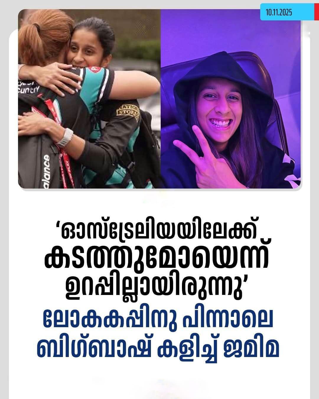 ലോകകപ്പ് സെമി ഫൈനലിൽ ഓസ്ട്രേലിയയെ തോൽപിച്ചാണ് ഇന്ത്യ ഫൈനലിനു യോഗ്യത നേടിയത്. സെമിയിൽ സെഞ്ചറി നേടി ഓസീസിനെതിരെ ഇന്ത്യയെ മുന്നിൽനിന്നു നയിച്ചതും ജമിമയായിരുന്നു.ലോകകപ്പ് നേടി ഒരാഴ്ച മാത്രം പിന്നിടുമ്പോൾ ഓസ്ട്രേലിയയിലേക്കു പറന്ന ജമിമ, ബ്രിസ്ബെയ്ൻ ഹീറ്റ്സിനു വേണ്ടി മെൽബൺ റെനഗേഡ്സിനെതിരെ കളിക്കുകയും ചെയ്തു.