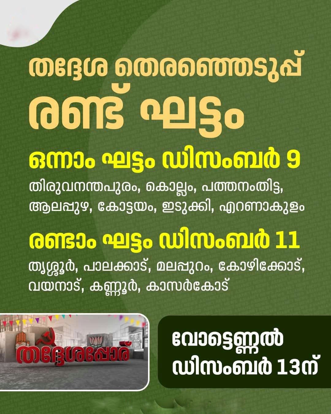 രണ്ടാം ഘട്ടത്തിൽ തൃശ്ശൂർ, പാലക്കാട്, മലപ്പുറം കോഴിക്കോട്, വയനാട്, കണ്ണൂര്, കാസര്കോട് എന്നീ ഏഴു ജില്ലകളിലും വോട്ടെടുപ്പ് നടക്കും. വോട്ടെടുപ്പ് വിജ്ഞാപന തീയതി മുതൽ പത്രിക നൽകാം.തെരഞ്ഞെടുപ്പിനായുള്ള എല്ലാ ഒരുക്കങ്ങളും പൂർത്തിയാക്കിയതായി സംസ്ഥാന തെരഞ്ഞെടുപ്പ് കമ്മീഷൻ വാര്ത്താസമ്മേളനത്തിൽ വ്യക്തമാക്കി.