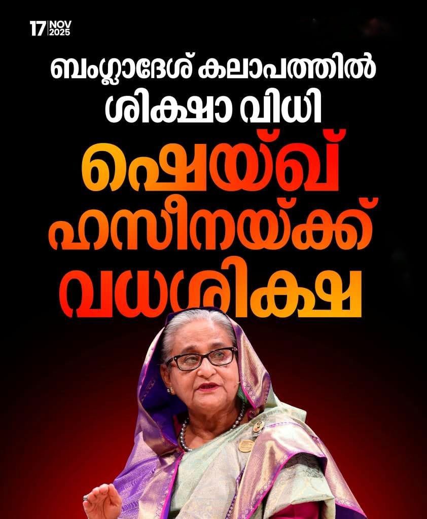 ധാക്ക ∙ ബംഗ്ലദേശിലെ സർക്കാർ വിരുദ്ധ കലാപം അടിച്ചമർത്തിയ കേസിൽ മുൻ പ്രധാനമന്ത്രി ഷെയ്ഖ് ഹസീനയ്ക്ക് വധശിക്ഷ. ദി ഇന്റർനാഷനൽ ക്രൈംസ് ട്രൈബ്യൂണൽ ഓഫ് ബംഗ്ലദേശാണ് (ഐസിടി-ബിഡി) ശിക്ഷ വിധിച്ചത്. ഈ വർഷം ഓഗസ്റ്റ് 3നാണ് ഷെയ്ഖ് ഹസീനയെ വിചാരണ ചെയ്യാൻ പ്രത്യേക ട്രൈബ്യൂണൽ അനുമതി നൽകിയത്.