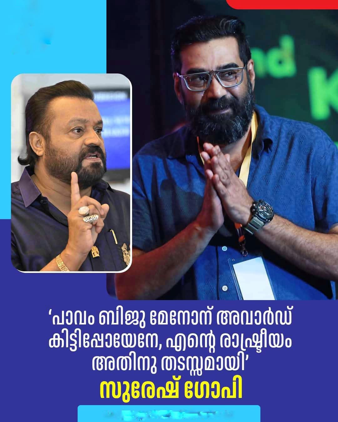 തന്റെ സിനിമകൾക്ക് അർഹമായ അംഗീകാരം കിട്ടാതെ പോയതിന് കാരണം തന്റെ രാഷ്ട്രീയമാണെന്ന് സുരേഷ് ഗോപി ചൂണ്ടിക്കാട്ടി. പുരസ്‌കാരം ഏറ്റുവാങ്ങിയ ശേഷം സംസാരിക്കുകയായിരുന്നു താരം.