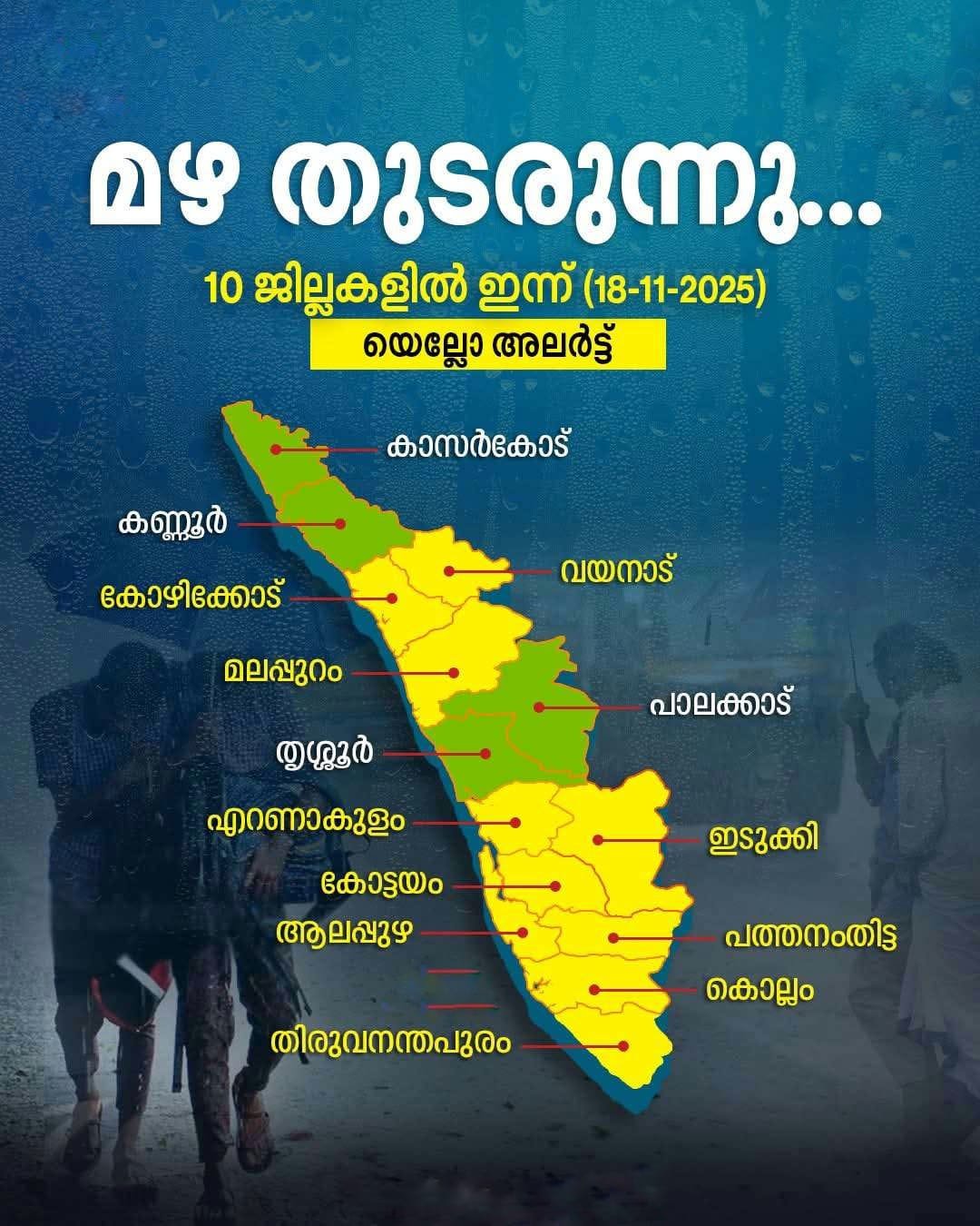 ഈ ജില്ലകളില്‍ പരക്കെ മഴകിട്ടും. ഒറ്റപ്പെട്ട ശക്തമായ മഴക്കും സാധ്യതയുണ്ട്. സന്നിധാനം, പമ്പ, നിലക്കല്‍ എന്നിവിടങ്ങളില്‍  ഇടിമിന്നലിനും ഇടത്തരം മഴക്കും സാധ്യതയുണ്ട്. മണിക്കൂറില്‍ 40 കിലോമീറ്റര്‍ വരെയുള്ള കാറ്റും ഉണ്ടാകും.കേരള – ലക്ഷദ്വീപ് തീരങ്ങളില്‍ ഇന്നും മല്‍സ്യബന്ധനത്തിന് പോകരുതെന്ന് കേന്ദ്ര കാലാവസ്ഥാ വകുപ്പ്.