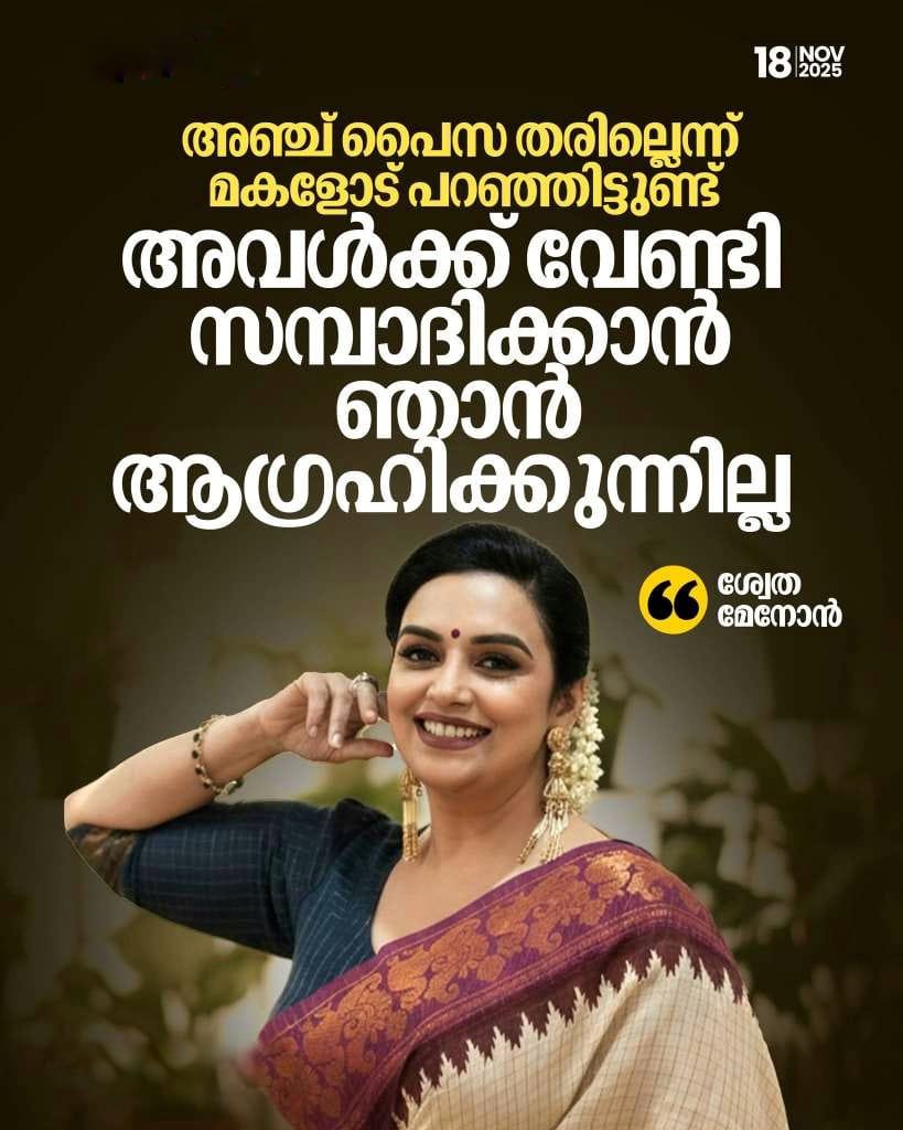 മകൾക്ക് നൽകാൻ കഴിയുന്നത് വിദ്യാഭ്യാസവും ആരോഗ്യവും നല്ല നിമിഷങ്ങളും മാത്രമാണ് അല്ലാതെ അവർക്ക് വേണ്ടി സമ്പാദിക്കാൻ ആഗാർഹിക്കുന്നില്ലെന്ന് ശ്വേത മേനോൻ പറഞ്ഞു.