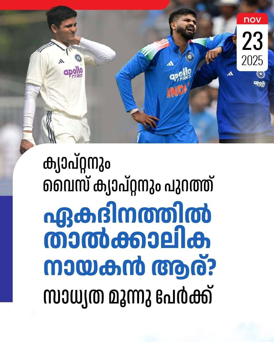 ടീമിന്റെ വൈസ് ക്യാപ്റ്റനായ ശ്രേയസ് അയ്യർ നേരത്തെ തന്നെ പരുക്കേറ്റ് പുറത്തായിരുന്നു. അഞ്ച് മാസത്തിലേറെ വിശ്രമം വേണ്ട ശ്രേയസ്, മാർച്ചിൽ ആരംഭിക്കുന്ന ഐപിഎലിലൂടെയാകും തിരിച്ചുവരവ് നടത്തുക. ക്യാപ്റ്റനും വൈസ് ക്യാപ്റ്റനും പരുക്കേറ്റ് പുറത്തായ സാഹചര്യത്തിൽ താൽക്കാലിക ക്യാപ്റ്റനെയാണ് ബിസിസിഐ തേടുന്നത്.