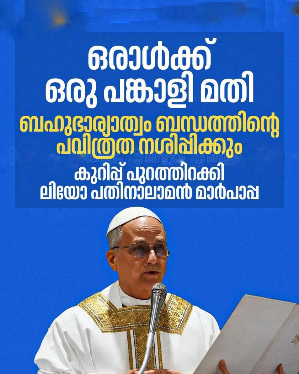 ഏകഭാര്യാത്വത്തെ സംബന്ധിച്ച് കുറിപ്പ് പുറത്തിറക്കി ലിയോ പതിനാലാമൻ മാർപാപ്പ. ജീവിതത്തില് ഒരാള്ക്ക് ഒരു പങ്കാളി മതിയെന്നാണ് വത്തിക്കാന് പുറത്തിറക്കിയ കുറിപ്പിൽ നിർദേശിക്കുന്നത്. കത്തോലിക്ക മതവിശ്വാസികളുടെ വിവാഹക്രമവുമായി ബന്ധപ്പെട്ടാണ് പുതിയ കുറിപ്പ് പുറത്തിറക്കിയത്.