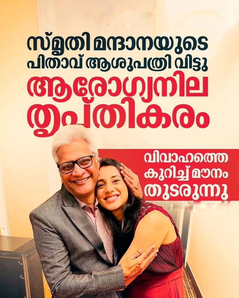ഇന്ത്യന്‍ ക്രിക്കറ്റ് താരം സ്മൃതി മന്ദാനയുടെ പിതാവ് ശ്രീനിവാസ് ആശുപത്രിയില്‍ നിന്നും വീട്ടില്‍ തിരിച്ചെത്തി. സ്മൃതിയുടെ വിവാഹാഘോഷങ്ങള്‍ക്കിടെ ശ്രീനിവാസന് നെഞ്ചു വേദനയും ദേഹാസ്വാസ്ഥ്യവും അനുഭവപ്പെട്ടതോടെയാണ് ആശുപത്രിയില്‍ പ്രവേശിപ്പിച്ചത്. പിതാവിന്റെ ആരോഗ്യനില മോശമായതോടെ വിവാഹം മാറ്റിവെക്കുന്നതായി പിന്നീട് അറിയിപ്പും ലഭിച്ചു.