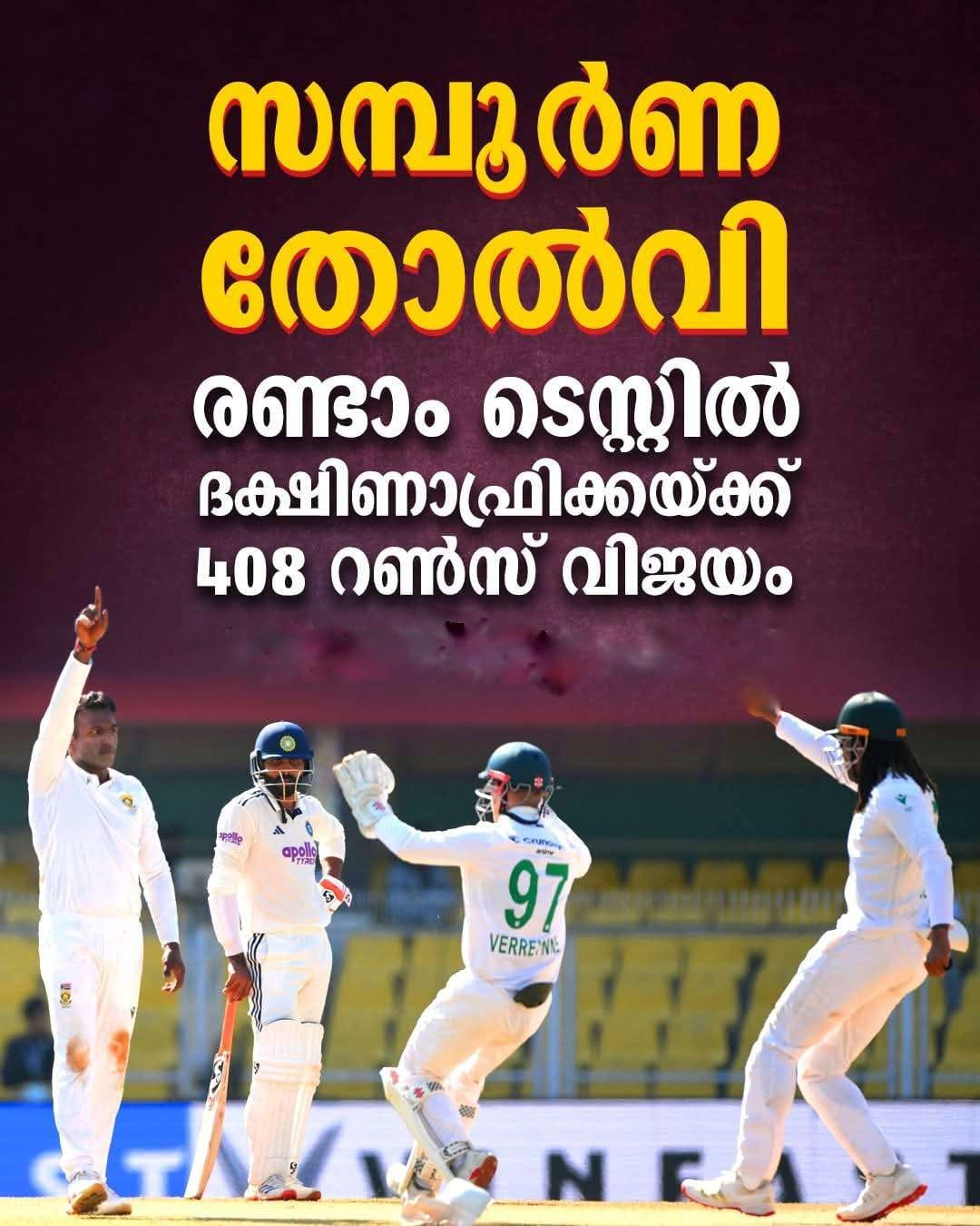 ഗുവാഹത്തി∙ അദ്ഭുതങ്ങളൊന്നും സംഭവിച്ചില്ല, അവസാന ദിവസം ദക്ഷിണാഫ്രിക്കയ്ക്കെതിരെ 549 റൺസ് വിജയലക്ഷ്യം പിന്തുടർന്ന് ഇറങ്ങിയ ഇന്ത്യയ്ക്ക് ‘ലഞ്ച് ടൈം’ വരെ പോലും അതിജീവിച്ചുനിൽക്കാൻ സാധിച്ചില്ല. ഫലം രണ്ടാം ടെസ്റ്റിൽ ഇന്ത്യയ്ക്ക് റൺ അടിസ്ഥാനത്തിലെ ഏറ്റവും വലിയ തോൽവി.