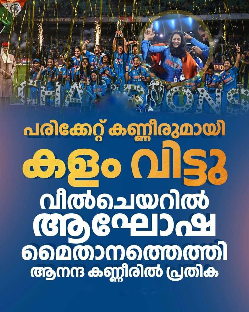 ഇന്ത്യൻ വനിതകൾ തങ്ങളുടെ ആദ്യ ലോക കിരീടം ഇന്നലെ ഏറ്റുവാങ്ങുമ്പോൾ ഒട്ടനവധി ഹൃദയം നിറക്കുന്ന കാഴ്ചക്കാണ് സാക്ഷിയായത്. ഗ്രൂപ്പ് റൗണ്ടിൽ അവസാന മത്സരത്തിൽ പരിക്കേറ്റ് വീൽചെയറിലായ പ്രതിക റാവലിന്റെ സാന്നിധ്യമായിരുന്നു അതിലൊന്ന്. കലാശ പോരിന് ശേഷം ഇന്ത്യൻ വനിതകൾ മൈതാനത്ത് ആഘോഷം…