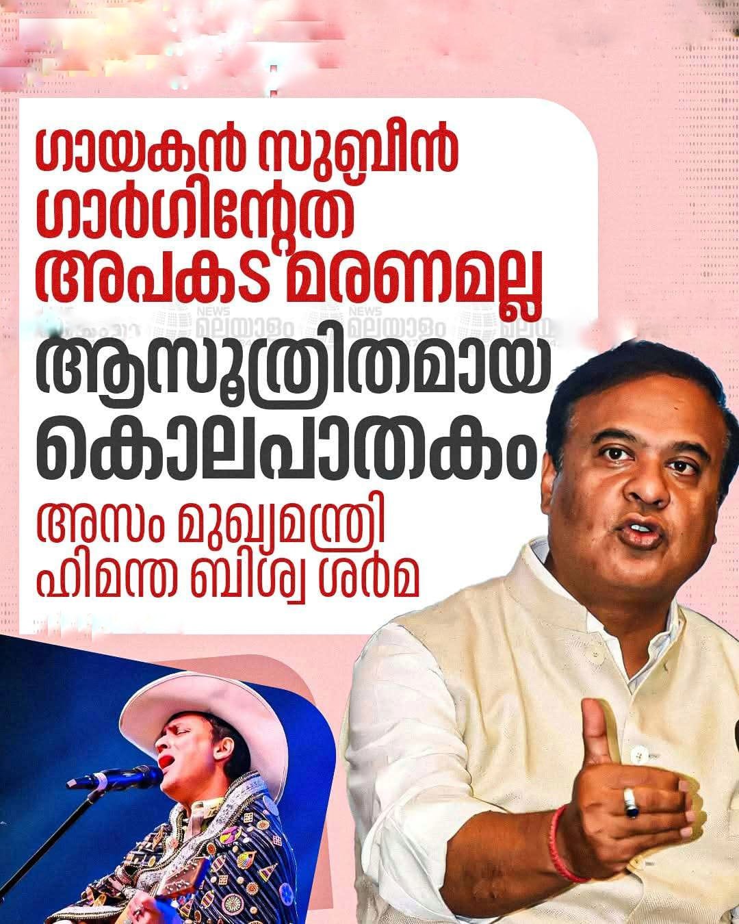 ഗായകന് സുബീന് ഗാര്ഗിന്റേത് അപകട മരണമല്ല ആസൂത്രിതമായ കൊലപാതകം അസം മുഖ്യമന്ത്രി