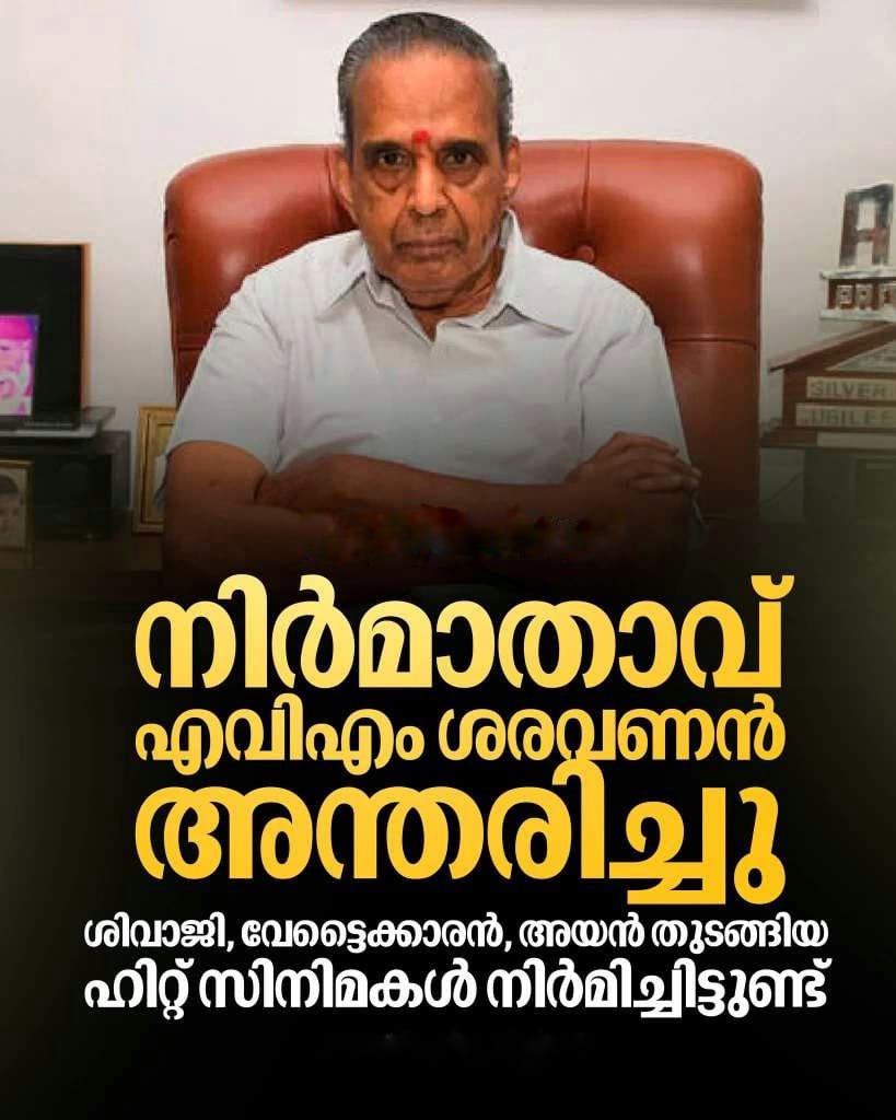 തമിഴ് സിനിമയിലെ പ്രമുഖ നിർമാതാവ് എ വി എം ശരവണന് എന്ന ശരവണന് സൂര്യമണി അന്തരിച്ചു. എവിഎം പ്രൊഡക്ഷന്സിന്റെയും എവിഎം സ്റ്റുഡിയോസിന്റെയും ഉടമയാണ്. ചെന്നൈയിലായിരുന്നു അന്ത്യം. മകന് എം എസ് ഗുഹനും ചലച്ചിത്ര നിർമാതാവാണ്.