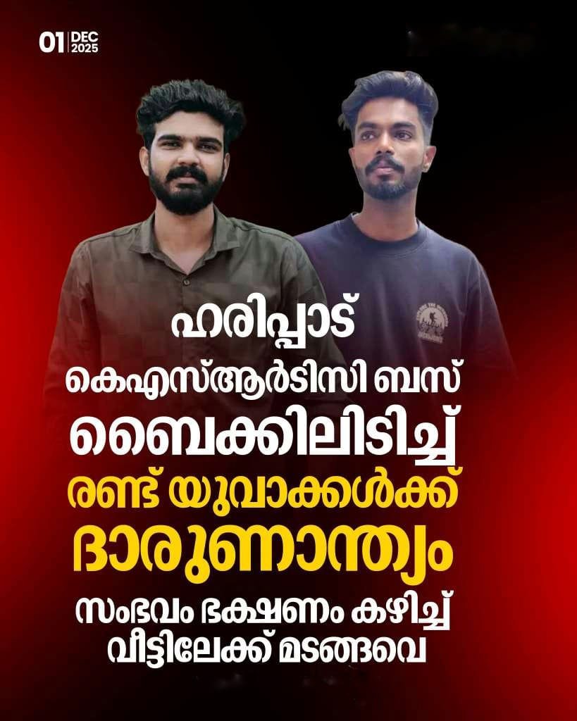 ഹരിപ്പാട് KSRTC ബസ് ബൈക്കിലിടിച്ച് രണ്ട് യുവാക്കൾക്ക് ദാരുണാന്ത്യം